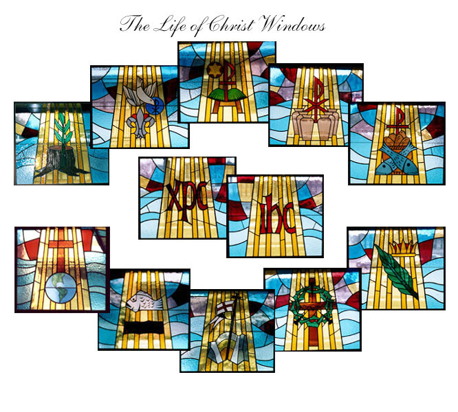 Prophecy Window Conception of Jesus Window Birth of Jesus Window Wedding in Cana Window Feeding the 5000 Window The Christ Window The Savior Window Palm Sunday Window Good Friday Window Resurrection Window Christian Church Window The Ruling Christ Window