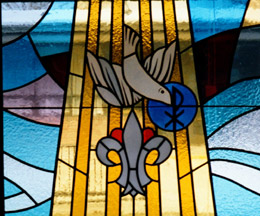 Each Sunday we confess, in the words of the Apostles' Creed, "I believe in Jesus Christ..., who was conceived by the Holy Spirit, born of the virgin Mary." This window depicts the Holy Spirit, in the form of a dove, descending to implant the very Son of God within the blessed Virgin. Because of the beauty of the lily and symmetry of the fleur-de-lis, a stylized lily, it has been a symbol for the Virgin Mary in her purity, the annunciation, and the human nature of Christ. |